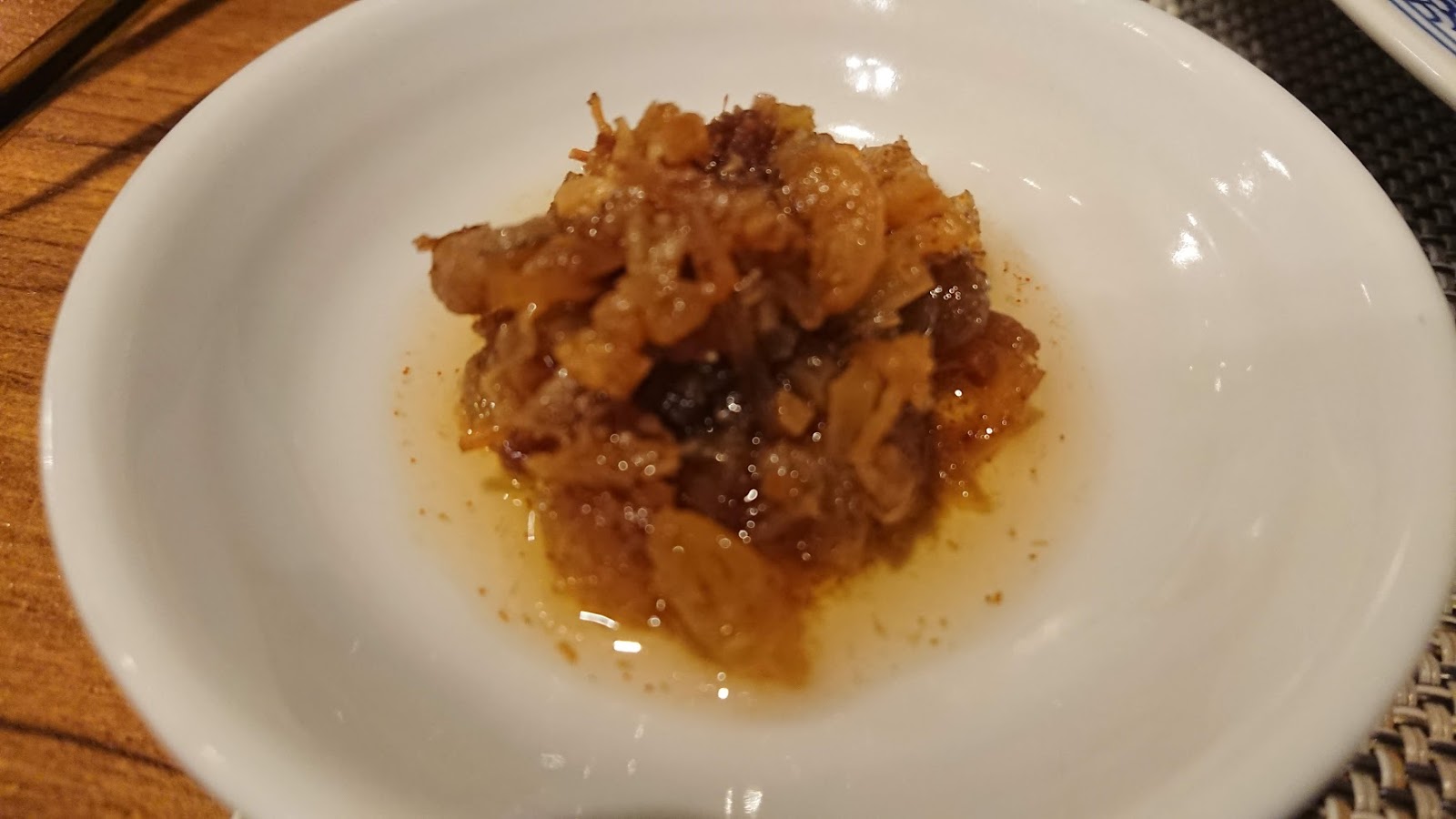 イカと空芯菜の炒め。小皿に、蝦醤、XO醤、それから蝦を激辛にした醤(謎)が添えられてきました。これらの調味料を少しづつ投下しながら楽しみます。蝦醤、XO醤の安定した美味しさもさることなら、この謎の蝦激辛も刺激的。これで焼きそばとか炒飯とか作ったら美味しそうです。